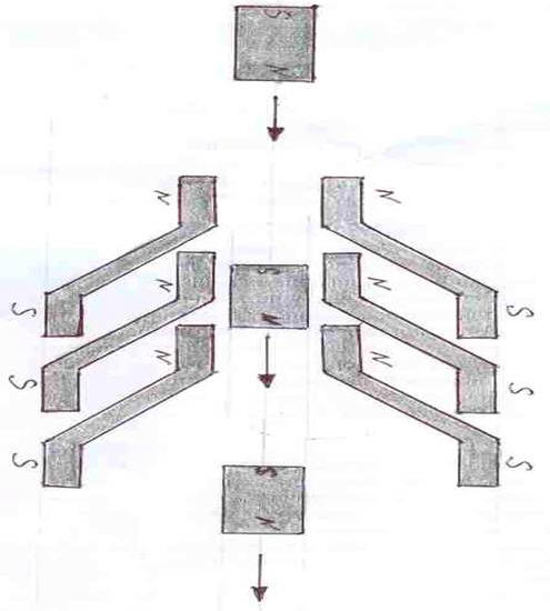 Для убедительности опыта установим 3 воронкообразных магнита так, что узкая часть последующего магнита почти до упора входила в широкую часть предыдущего воронкообразного магнита (фиг. 2). Если цилиндрический магнит приблизить торцевой частью, где расположен северный полюс N к узкой части первого воронкообразного магнита , где расположен северный полюс N , то в начале на расстоянии около 3 см будет слабое сопротивление.