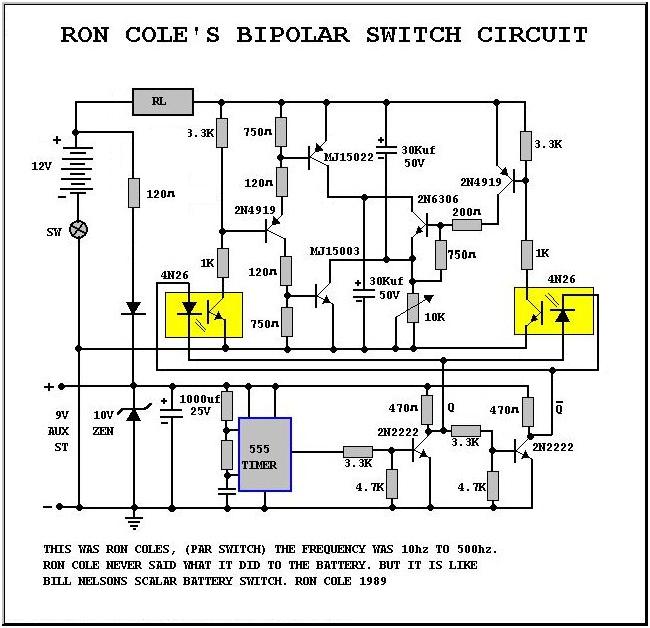 Ещё схема Рона Кола. Частота от 10 Гц до 500 Гц. Рона Кол никогда не говорил, что эта за схема. Но она выглядит аналогично скалярному переключателю батареи Билла Нельсона.