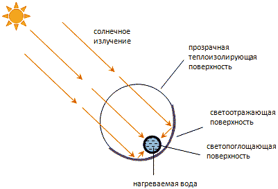 Пластиковая, металлическая (стальные, медные, алюминиевые, но может быть коррозия) или резиновая черная трубка служит контуром для транспортировки теплоносителя (воды). Трубка проходит через пластиковые бутылки, которые образовывают герметичные оболочки. Задняя сторона бутылок покрыта металлической фольгой, которая отражает солнечные лучи и направляет их на разогрев теплоносителя. У чистых прозрачных примерно одинаковых бутылок срезается горлышко и дно для образования сплошной трубы. Перед наклейкой липкой лентой фольги бутылку промыть и высушить.