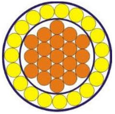В центре находятся 19 изолированных проводов, покрытых общим слоем изоляции (на рисунке показано коричневым) для небольшого увеличения диаметра, чтобы сверху вместилось тоже 19. Это очень важный момент, так как при разных количествах не будет соблюдаться вихревая симметрия емкости. С одного торца все жилы соединяются вместе, а с другого — делаются два вывода от центральной и от внешней обмоток витка. Естественно, можно пробовать и более простые варианты, например с многожильным кабелем. Для съема энергии с такого коллектора необходимо включать его параллельно нагрузке, желательно в контуре с обмотками, не имеющими противо-ЭДС по напряжению.