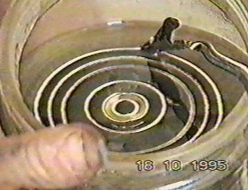 В последовательности импульсов должен быть короткий перерыв. Через идеальный конденсатор ток не течет. Рассматривая воду как идеальный конденсатор, убеждаемся, что энергия не будет расходоваться на нагрев воды. Реальная вода обладает некоторой остаточной проводимостью, обусловленной наличием примесей. Лучше, если вода в ячейке будет химически чистой. Электролит к воде не добавляется. В процессе электрического резонанса может быть достигнут любой уровень потенциала. Как отмечалось выше, емкость зависит от диэлектрической проницаемости воды и размеров конденсатора. В примере схемы два концентрических цилиндра 4 дюймов длиной составляют конденсатор. Расстояние между поверхностями цилиндров 0.0625 дюйма. Резонанс в схеме был достигнут при импульсе 26 вольт, приложенном к первичной обмотке.