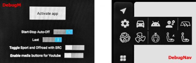 DebugNav — две дополнительные кнопки на панели для быстрого открытия сплита с выбранными приложениями. Долгим нажатием текущее приложение временно становится дополнительным в сплите, а основное подгружается из настроек (так удобно переключаться между плеерами, если основно приложение это навигатор). Кнопка быстрых настроек выдает доступ ко всем основным настройкам системы, плюс перевод дворников в сервисный режим, подогревы сидений и руля, вызов макросов, переключение режимов вождения.