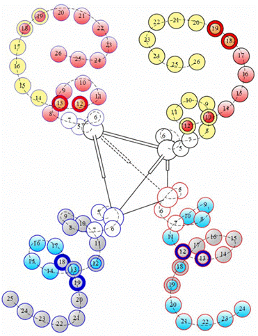 Показана спираль развития, эволюционного развития из одной стабильной комбинации в другую. В основании которой антисимметричный тетраэдр (рис.3,4), левое и правое, внутреннее и внешнее которого влияет и на всю спираль (отсюда и разные цвета). Через простые числа проходят оси: