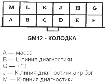 Разъём для прошивки и диагностики: GM12. Это старый тип разъёмов. В новых машинах стоит OBD-II, где используется другой протокол обмена данными. Штырьки нашего k-line адаптера вставляем в соответствующие гнёзда, красный ( 12) в "G", чёрный (масса) в "A" и синий (k-line) к "M".