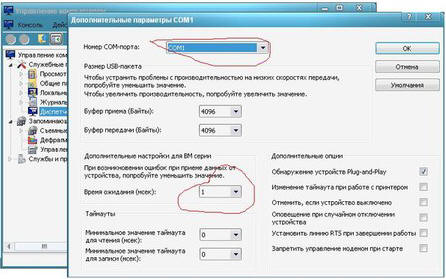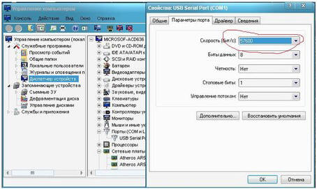 Настройка. Заходим в Панель управления компьютера -> Диспетчер устройств -> Порты -> USB Serial Port -> свойства USB Serial Port: параметры порта -> Скорость -> 57600 (для некоторых старых программ надо ставить поменьше, например: 9600) параметры порта -> дополнительно -> номер COM порта -> COM1 параметры порта -> дополнительно -> время ожидания -> 1 мсек.