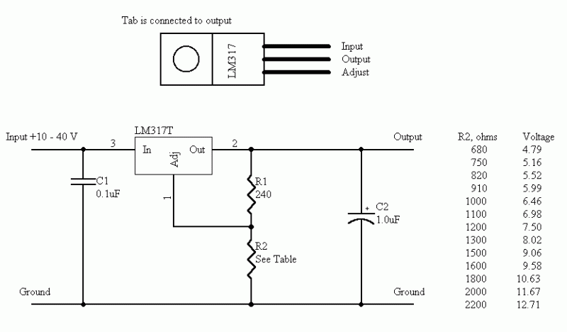 В зависимости от резистора R2 можно получить разные напряжения на выходе для блока питания, рассчитанный на ток до 1,5 Ампера. Можно поставить переменный резистор для плавного изменения выходного напряжения. Вот примерные значения сопротивления R2 и соответствующие значения выходного напряжения: