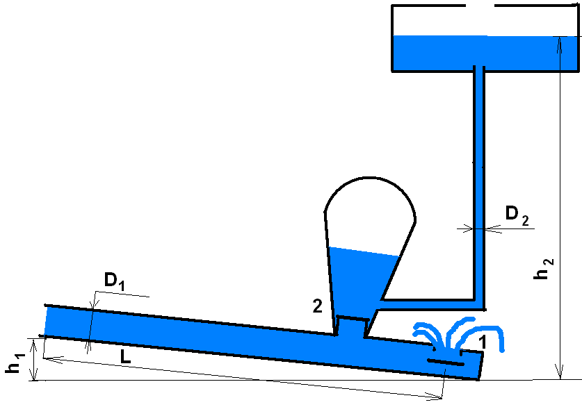 Тут надо сделать замечание. Уклон, о котором мы говорим, это уклон водной поверхности реки. Если мы трубу под водой положим клапаном 1 на дно, а начало трубы поднимем к поверхности, то геометрический наклон увеличится, а гидравлический - нет.