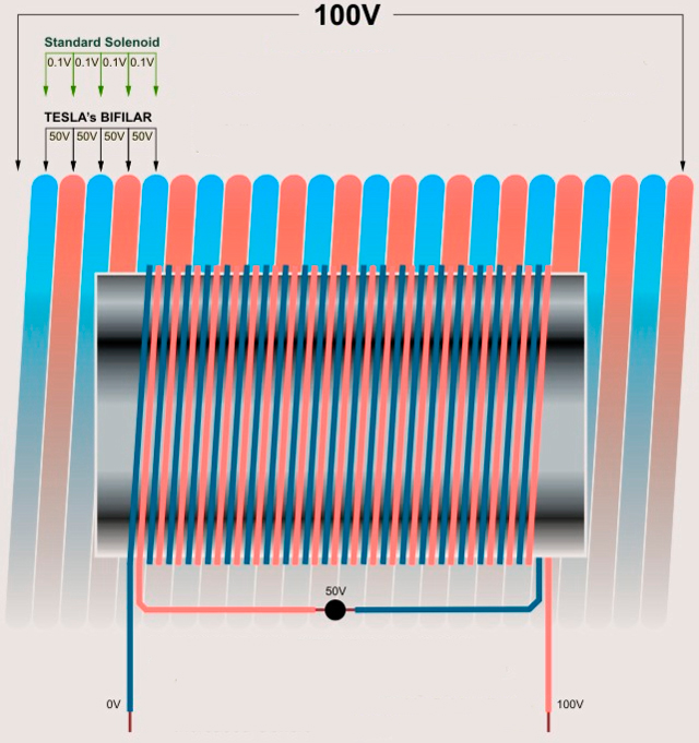 Бифиляр - (би - два, намотка в два провода) это способов увеличения емкости обмотки, чтобы больше передать мощности. Для этого делается послойная намотка двойным проводом в одну сторону с дальнейшим соединением сначала нечетных слоев с концом четных. Такой способ резко увеличивает плотность и добротность намотки, а также получается, что напряжение на соседних слоях равно половине питающего. В результате большее напряжение (больший радиус вихря) мы упаковываем в меньшем зазоре, что резко поднимает емкость обмотки: