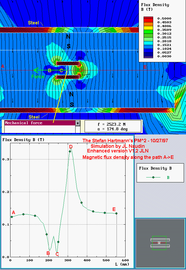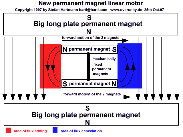 I have added a steel plates on magnetic bars at the outside of the apparatus. This steel plates contributes to build a constant magnetic flux density between the magnetic bars. In spite of this change ( a constant magnetic field density ), the resulting force always exists, this seems to confirm that a rotary version is able to work in a rotary closed loop. A rotary PM^2 can be designed by mounting two ring magnets shielded by two steel plates and the two magnetic sliders rotating between them (see below).