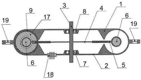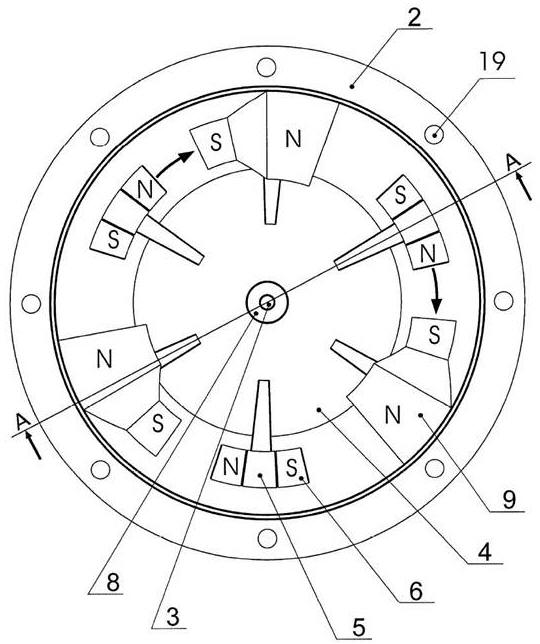 Как показано на фиг. 2, магнитные элементы 6, закрепленные в держателях 5 на вращающемся роторе 4, могут проходить через канал 13 каждого неподвижного магнитного элемента 9. Поскольку магнитные элементы 6 закреплены в держателях 5, то для обеспечения возможности прохождения каждого магнитного элемента 6 через канал каждого магнитного элемента 9, на каждом магнитном элементе 9 выполнена плоская щель 16 (Фиг.6, 7, 8). В канале 13 магнитного элемента 9 коаксиально расположена, по крайней мере, одна электрическая обмотка 17 ( Фиг.7, 9, 10). Выводы электрических обмоток 17 всех неподвижных магнитных элементов 9 выведены на общий разъем 18 ( Фиг.1, 4). Каждая электрическая обмотка 17, выполнена таким образом, чтобы ее витки не перекрывали плоскую щель 16, соединяющую сквозной канал 13 с внешней поверхностью магнитного элемента 9 ( Фиг.9, 10). Этим обеспечивается прохождение держателя 5 и магнитного элемента 6 через канал магнитного элемента 9 . Как видно из фиг. 3, неподвижные магнитные элементы 9 и подвижные магнитные элементы 6, чередуясь, расположены друг за другом в одной плоскости перемещения. Верхняя часть корпуса 1 и нижняя часть корпуса 2 соединяются посредством крепежных элементов, проходящих через отверстия 19 (Фиг.2, 3, 4, 5) в верхней и нижней частях корпуса.