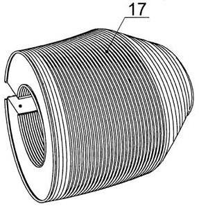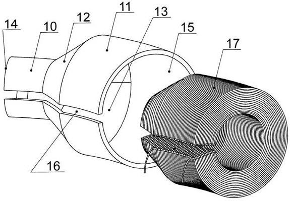 на фиг. 9 - внешний вид электрической обмотки, витки которой уложены таким образом, чтобы не перекрывать плоскую щель, соединяющую сквозной канал с внешней поверхностью неподвижного элемента.