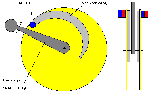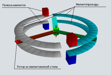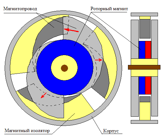 Ротор состоит из двух одинаковых фигурных толстых пластин магнитопроводов, между которыми круглый магнит. В итоге эти два (светло-серых) магнитоппровода ротора являются как бы продолжением полюсов магнита.