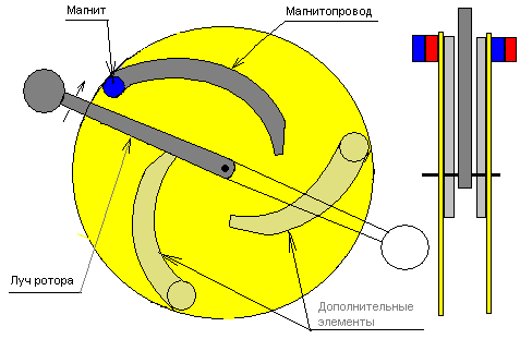 Останавливающий импульс момента выхода железного луча ротора из зазора магнитопровода скомпенсирован уменьшением приложенного момента. В принципе затем можно расположить еще один или несколько магнитопроводов перехватывающий луч ротора, но это только для улучшения характеристик.