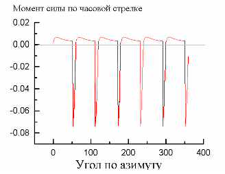 Момент силы по часовой стрелке, вращающий пропеллер из трех лопастей (стержней), расположенных под углом 120 градусов. На рисунке хорошо видны 6 отрицательных всплесков ( стремящихся повернуть пропеллер против часовой стрелки ). Причем, чем меньше зазор между ротором и статором, тем сильнее "всплески" момента сил против часовой стрелки и тем меньше по сравнению с ними суммарная тяга по часовой стрелке (сравниваются площади графика <+> и <->).