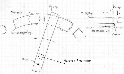Как видно из рисунка, в качестве ротора применялся прямоугольный в сечении стержень из мягкого металла (кусок строительной арматуры 140 х 12 х 6 мм) посаженный за один конец на ось с подшипником, в качестве магнитопроводов использовались отрезки того-же прутка длиной 60 мм. В качестве магнитов применялись таблетки диаметром 12 мм и толщиной 3 мм каких-то сильных магнитов (купленных на рынке с рук, стальной блеск и очень любят раскалываться когда схлопываются). В качестве подстроечного магнита применялся кусочек магнитной крошки 3 х 4мм - им двигали вдоль ротора в пределах 1...3 см от оси. Ротор проходил над статорными пластинами на 3-5 мм (по кругу была разная высота - так уж получилось....) Зазор между пластинами статора регулировался 5...10 мм во время настройки конструкции в зависимости от неоднородности силы магнитных таблеток.