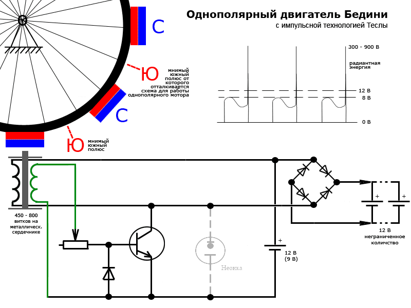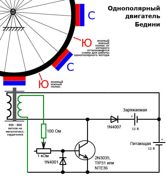 Состоит двигатель из колеса на котором размещены магниты северными полюсами наружу и катушек намотанных бифилярно на одном стержне. Проходя мимо катушки магниты наводят в ней напряжение, которое открывает транзистор (зелёным цветом на схеме). От батареи, через другую катушку и открытый транзистор начинает течь ток, появляется магнитное поле вокруг катушки, которое в момент прохождения мнимого южного полюса толкает колесо и так цикл повторяется. Коммутации транзистора вызывают в импульсах высоковольтные импульсы, которые мы захватываем через диодный мост и подаём в заражаемые батареи, которых может быть большое количество.