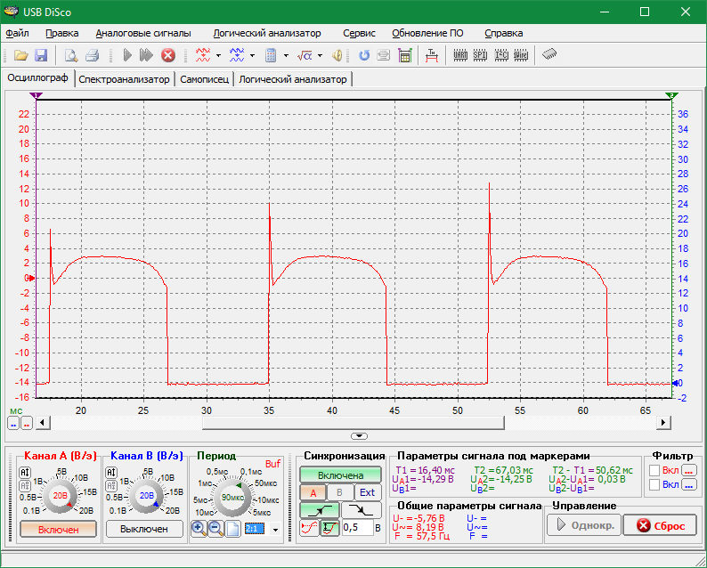 При подключении USB осциллографа BA8020 я увидел следующую картинку (USB осциллограф физически не может фиксировать высоковольтные диапазоны и пики короткие):