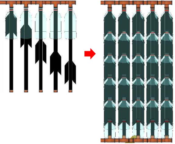 Медные трубки с плотно надетыми медными "крылышками" для увеличения площади и увеличения КПД.Всё это вставленно в пластиковые бутылки с обрезанными донышками. Бутылки между собой герметично соединены.
