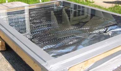 Радиатор от старого холодильника помещается в герметичную конструкцию. Снизу фольга, сверху стекло. Очень простая конструкция: