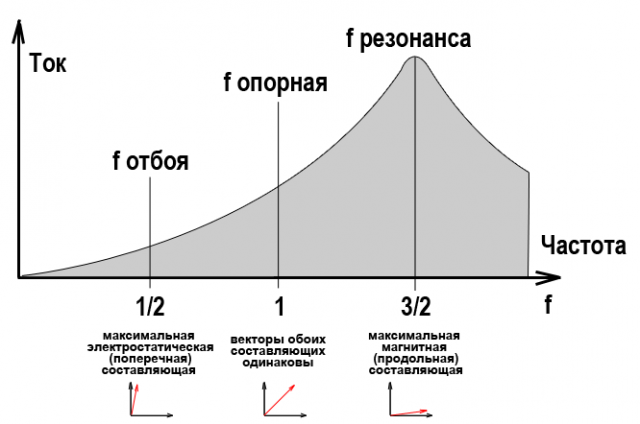 Резонансная частота катушки - частота на которой происходит максимальное взаимодействие с внешней средой через электромагнитную составляющую. АЧХ катушки хорошо показывает это воздействие. В этот момент магнитная (продольная) составляющая катушки максимальна, а электростатическая (поперечная) минимальна. Резонансная частота катушки равна 1,5 от опорной частоты. Т.е. это частота, на которой максимальные затраты от источника (выброс в среду), т.к. максимально не попадаем в гармонические колебания f=1/2. Стивен Марк говорил, что подавая на две обмотки две частоты, одна при этом в два раза больше другой мы получим прирост. Но он не уточнял, что должны подавать f=1/2 и f=1, а получим f=3/2.