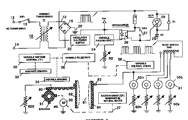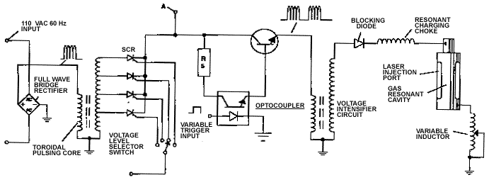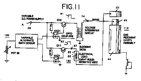 Значительные отличия заключаются в питании ячейки. Мэйер использует внешнюю индуктивность, которая образует колебательный контур с емкостью ячейки, - чистая вода, по-видимому, обладает диэлектрической проницаемостью около 5, - чтобы создать параллельную резонансную схему. Она возбуждается мощным импульсным генератором, который вместе с емкостью ячейки и выпрямительным диодом составляет схему накачки. Высокая частота импульсов производит ступенчато поднимающийся потенциал на электродах ячейки до тех пор, пока не достигается точка, где молекула воды распадается и возникает кратковременный импульс тока. Схема измерения тока питания выявляет этот скачок и запирает источник импульсов на несколько циклов, позволяя воде восстановиться.