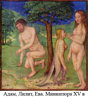 XII. Затем придумал Сатанаил и решил сотворить человека по образу своему и подобию, ибо видел он людей на земле созданных невидимым Отцом (29). И создал он два тела человеческих и повелел ангелам второго неба войти в глиняные тела (30). И Сатанаил назвал человека в образе мужчины - Адам, а в образе женщины - Лилит (31) . И начали они спорить, кто из них старший, и спор их был великий, ибо созданы они по образу и подобию Сатанаила. И устал Сатанаил от споров их, и отдалил Адама от Лилит.