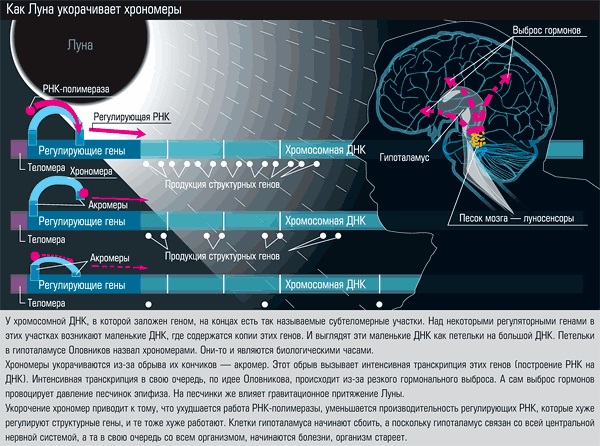 ! ЭПИФИЗ – "луносенсор", который реагирует на Т-ритм – это лунный 28-дневный ритм, контролирующий продолжительность жизни. Важнейшим компонентом этого луносенсора является песок (brain sand), представляющий собой кальциевые камушки, которые находятся в межклеточном пространстве в эпифизе, или иначе в шишковидной железе нашего мозга. Они плотнее и крупнее клеток и под влиянием Луны, особенно сильно в период новолуний, давят на клетки эпифиза, и те начинают в ответ выбрасывать из этой эндокринной железы нейропептидные гормоны, находящиеся в специальных клеточных пузырьках-вакуолях. Так формируется пик выброса гормонов. Эпифизарные гормоны атакуют гипоталамус, стимулируют его, через него – гипофиз, и суммарно возникает гормональный коктейль, который укорачивает редумеры, которые, как маленькие петельки, располагаются на хромосомной ДНК. Редумеры ученые открыли в митохондриях совсем недавно. Это считается причиной старения. Ещё смотри шишковидная железа, мелатонин.