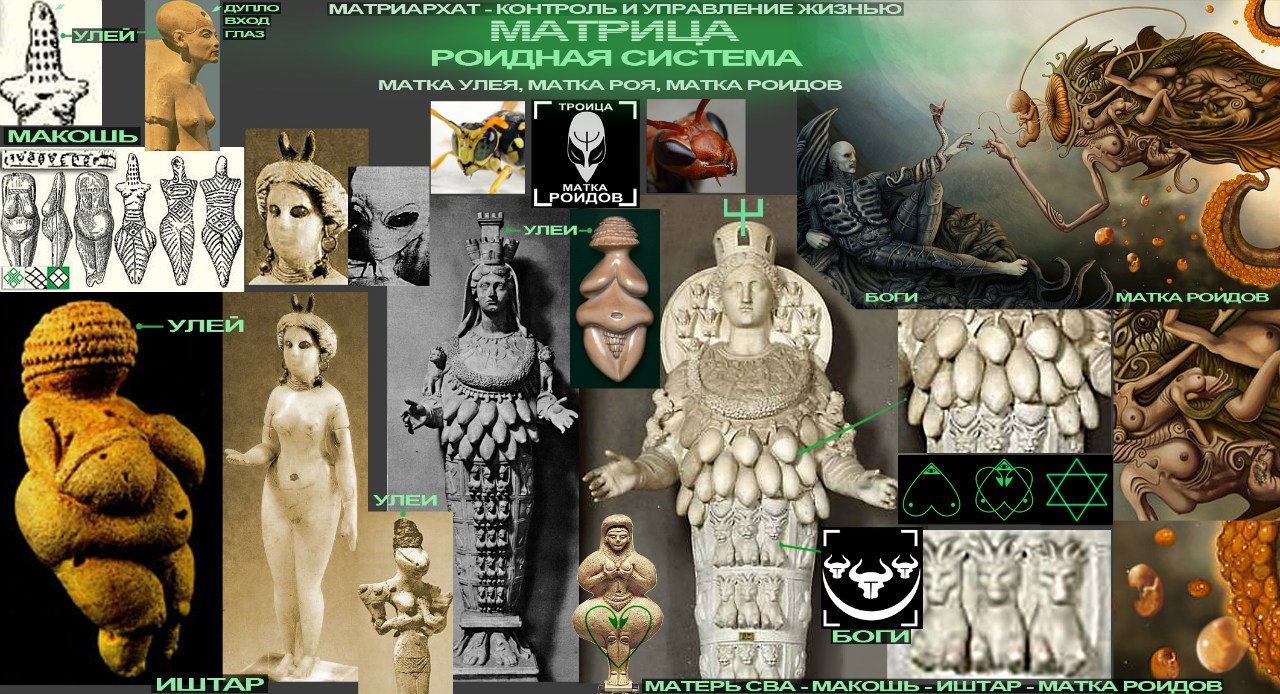 ! МАТКА - самка в роидном сообществе. Матка серых (роидная цивилизация пришельцев). Матка, "матерь всего сущего" в разные времена называлась по разному: Махадэви, Дурга, Кали, Астарта, Иштар, Макошь и т.д. И рабы и цари приносили ей кровавые жертвы, стариков и младенцев. Матерь Сва в ведизме - начало всего их божественного и рогатого. Вилы (символ Е или Э) - знак троицы - матки роидов. Ещё богородица.