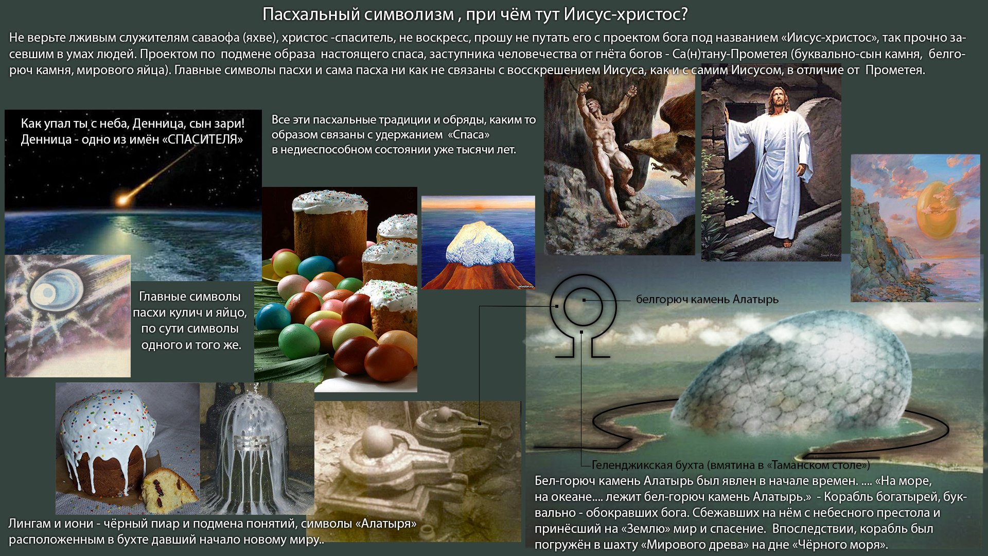 ! ПАСХА – главный христианский праздник, связанный с воскрешением Иисуса Христа, который был распят на иудейский праздник Песах в жертву их иудейского бога Яхве. Вытек из еврейского праздника Пе́сах, который празднуется в честь исхода евреев из Египта, когда Яхве убил всех первенцев, а евреи обокрали египтян (Исход 12). Главные атрибуты праздника – кулич (паска) с белой глазурью сверху и яйцами – символ мужского члена в момент эякуляции. Эти атрибуты пришли из египетского культа Изиды. В мифах, часть которых дошла до нашего времени в известном пересказе Плутарха, египетская богиня Изида хорошо известна как верная супруга Осириса, тело которого она нашла в долгих странствиях после того, как того убил его родной брат Сет. Собрав воедино разрубленные на части останки Осириса, кроме гениталий, которых она так и не нашла. Исида с помощью бога Анубиса сделала из останков первую мумию. Ту часть которой не хватало, мужское население отрезало себе и кидало на жертвенник. Вдохнув своими крыльями в забальзамированный труп Осириса на несколько мгновений дыхание жизни, богиня волшебным образом зачала от него своего сына Хора. В храме Хатхор в Дендере и храме Осириса в Абидосе сохранились рельефные композиции, на которых показан сокровенный акт зачатия сына богиней в образе соколицы, распростёртой над мумией супруга. В память об этом Изида часто изображалась в облике прекрасной женщины с птичьими крыльями, которыми она защищает Осириса, царя или просто умершего. Изида часто предстает и коленопреклоненной, в белой повязке афнет, оплакивающая каждого усопшего так, как когда-то оплакивала самого Осириса. Позже, обряд отрезания гениталий заменили на символичный: сделали кулич в виде фаллоса и куриные яйца, которые больше всего подходят по размеру. Красить яйца и стукаться ими пришло в христианство из славянского праздника Пасхет.