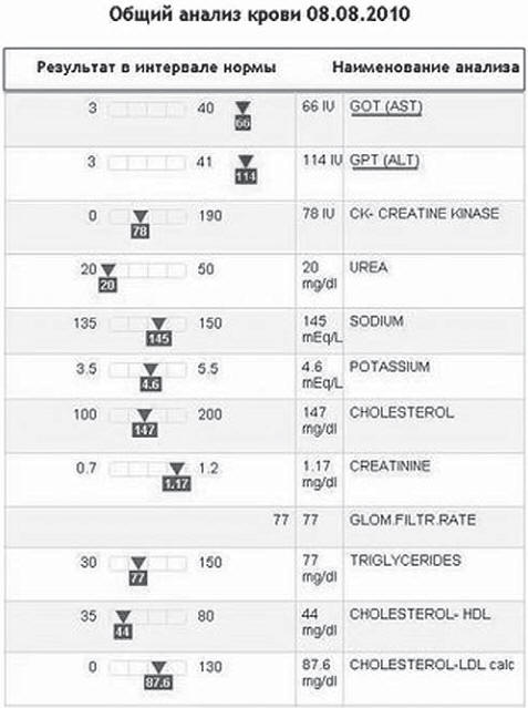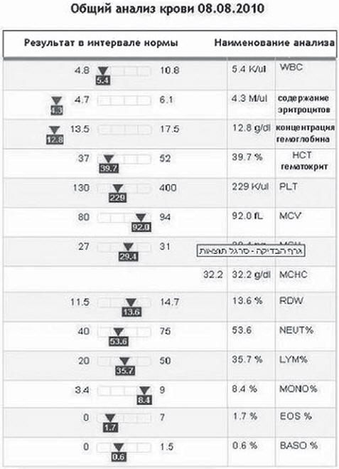 В конце второго месяца эксперимента, 08.08.2010, произведён первый общий анализ крови. Его результаты можно посмотреть в таблицах.