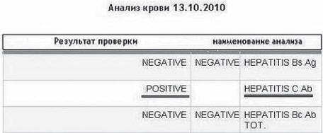 На основании полученных результатов был назначен дополнительный анализ крови на проверку наличия в организме различных форм гепатита, который был произведён 13.10.2010 г.