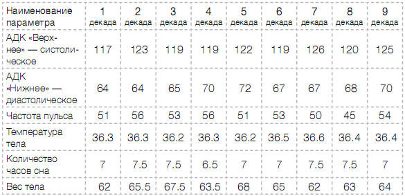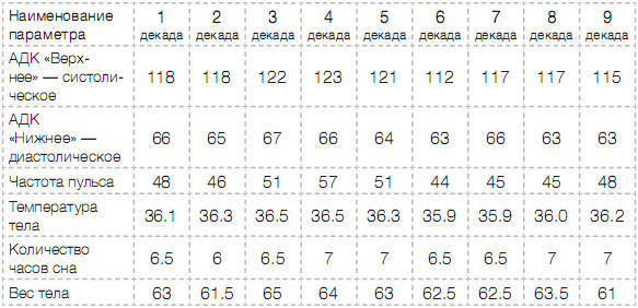 На протяжении всего периода наблюдения производились ежедневные измерения артериального давления, частоты пульса, температуры тела, а также фиксировалось соотношение часов сна и бодрствования. Данные этих измерений представлены в виде таблиц средних значений исследуемых параметров, полученных за 10-дневные периоды наблюдений. (1,2) Также в конце каждой декады производилось измерение веса тела.