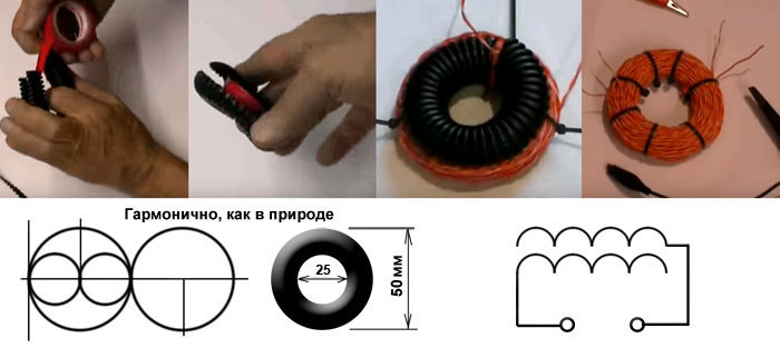 Провод берём UTP (это витая пара для подключения интернета). Из этого провода достаем одну витую пару (двойной скрученный провод) длиной ~18 метров и мотаем наш тор. В итоге получаем своеобразный конденсатор-индуктивность, емкость которого является межвитковой (межпроводковой) емкостью, созданной изоляцией проводов витой пары и зазором между ними. Подавать питание на начало одного проводка и на конец другого, а оставшиеся оставлять в воздухе (схема на рисунке).
