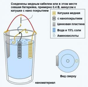 ZnO - состоит из цинковой пластины + спираль из нанопокрытой (обожжённой) меди + спираль из обычной меди + водный соляной раствор 15%. От каждого электрода идёт тонкая медная проволока и эти три проволоки соединяются между собой единой скруткой.