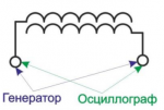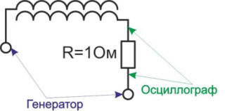 2 вариант. Для более точного измерения подключаем осциллограф к резистору 1 Ом (рис 4), параллельно подключённом к катушке, т.е. измеряем осциллографом падение напряжение на резисторе 1 Ом и ищем максимальный размах синуса.