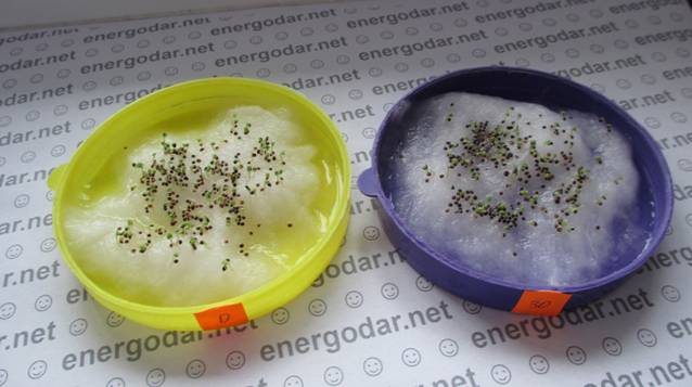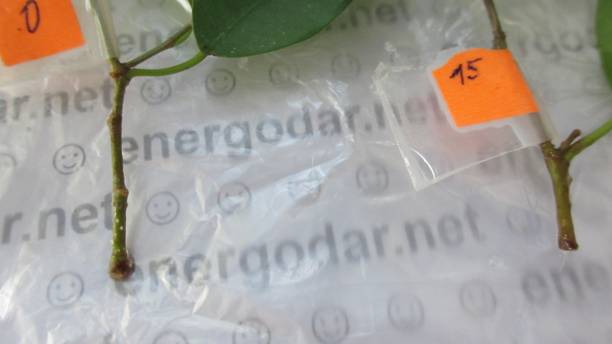 Семена чабреца без обработки находились в жёлтой крышке, с 30-минутной обработкой - в фиолетовой крышке, а на черенках фикуса прикреплены соответствующие ярлычки.