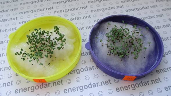 Через 6 дней уже зеленели небольшие лужайки в обеих группах семян чабреца. Обратите внимание, что обе группы развиваются приблизительно одинаково: