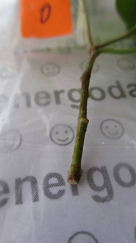 А у парочки черенков без обработки и с однократной обработкой есть первые заметные изменения: у черенка без обработки появились на основании черенка белые точки и выпуклости (начало укоренения) и у череночка с однократной обработкой такие же малюсенькие выпуклости и волосинка-корешок с правой стороны у среза черенка: