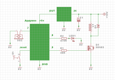 После 20 минут работы — два звуковых сигнала, гасится контрольный светодиод, прекращается генерация. Для повторного запуска нужно нажать кнопку резет. Блок питания 19 вольт должен быть минимум на 3.5 А. Так как в момент импульса ток через катушку достигает 6 - 6.3 А и в блоке питания может сработать защита. Если это происходит, то нужно увеличить ёмкость конденсатора С1 до 10000 мк. (а так рекомендуемая ёмкость 4700 мк). Транзистор может быть любой — 30N03, 45N03, 50N03, 60N03. Диод D1 с барьером шоттки на ток 2-5А, рабочее напряжение 40-60 вольт. Прибор в настройке не нуждается, при правильной сборке и программировании сразу начинает работать.