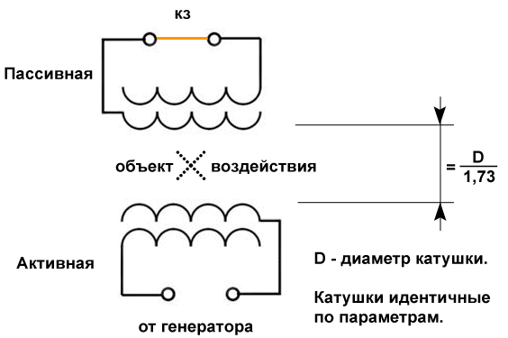 Можно сеансы проводить с двумя идентичными по параметрам катушками. Одна из которых подключается к генератору, а вторая закорачивается. Расстояние между ними рассчитывается по формуле: внешний диаметр поделить на 1,73: