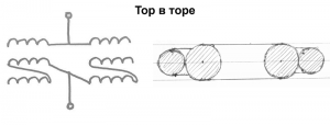 "...из простого наверное тор внутри тора, но придется трифиляром мотать, и один провод через оба прокинуть, иначе не будет емкости, результирующая частота будет промодулирована еще разницей хода левого и правого тора (если от центральной точки смотреть)...