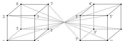 Т.е. мы получили проекцию квадрата, у которого 4 опорные точки. Чтобы получить фигуру трехмерного пространства мы должны "а" второе спроецировать на "а" второе. Объясняю, что мы делаем. Мы должны провести проекцию уже не к линии, к отрезку, мы должны провести проекцию квадрата на длину квадрата. И мы получили уже куб. И сколько опорных точек? - восемь: