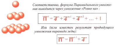 Пирамидальная система умножения изначально охватывает трехмерные производные (длина, ширина, высота), это означает то, что двухмерного (плоскостного) умножения не содержит. При пирамидальном умножении второй множитель указывает на количество мерных точек (количество рядов) по данным направлениям (прим. по всем трем направлениям в пирамидальной структуре). Изначальной структурой данного умножения является Малая Пирамида. Пирамидальное умножение используется для вычисления количественных объемов. В древние времена данной системой умножения пользовались при строительстве пирамид, храмов, зикуратов (пирамида с усеченным верхом), капищ и т.д. Пирамида ЖДЫ два равна чему?- пяти: