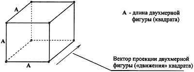 Т.е. мы получили проекцию квадрата, у которого 4 опорные точки. Чтобы получить фигуру трехмерного пространства мы должны "а" второе спроецировать на "а" второе. Объясняю, что мы делаем. Мы должны провести проекцию уже не к линии, к отрезку, мы должны провести проекцию квадрата на длину квадрата. И мы получили уже куб. И сколько опорных точек? - восемь:
