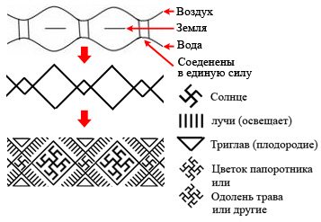 Это покровительство Природной силы человека переплеталась с Природной силой Божьей. Ведь Бог же покровительствует человеку. Были и другие орнаменты. Была, допустим, многослойная вязь, когда вода контактировала с воздухом и землёй и соединялась в единую силу: